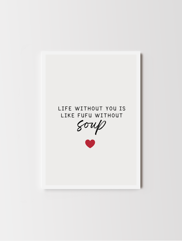 Shop our stunning and funny 'Life without you is like fufu without soup' Valentine's Day card, perfect for him or her. Surprise your special someone with a one-of-a-kind card that will surely bring a smile to their face.